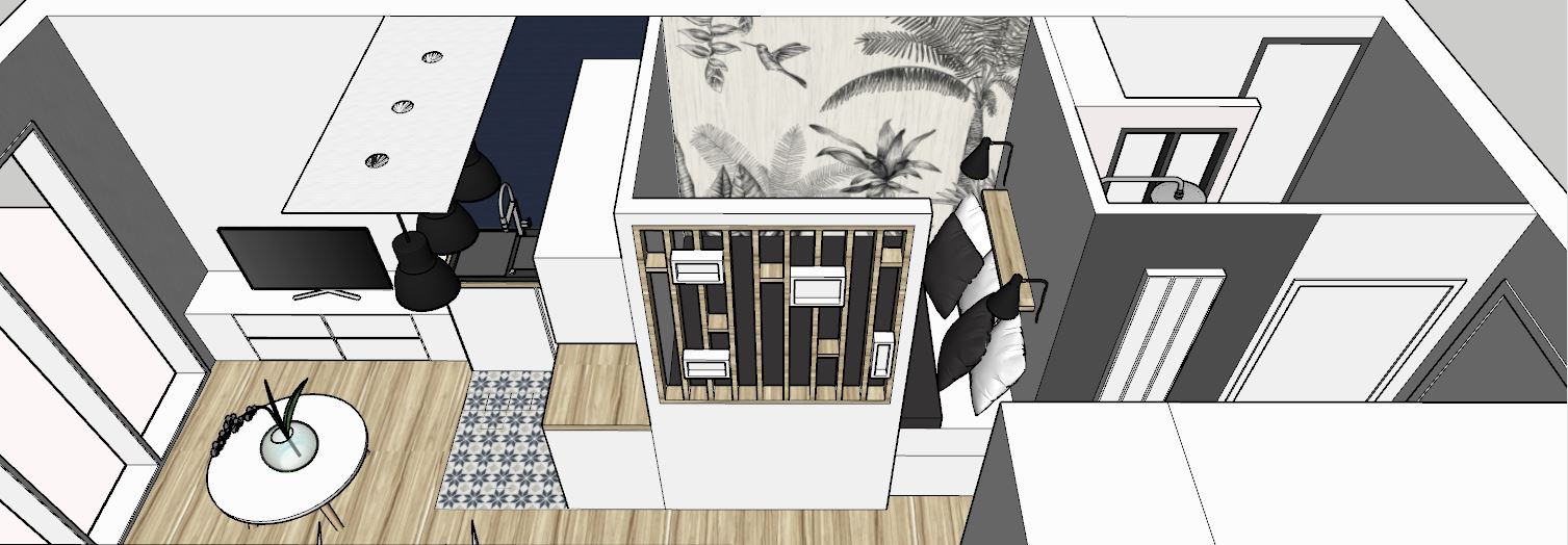 - Créant l’ébauche de l’appartement comprenant une salle d’eau, une cuisine, un coin nuit et un coin salon.